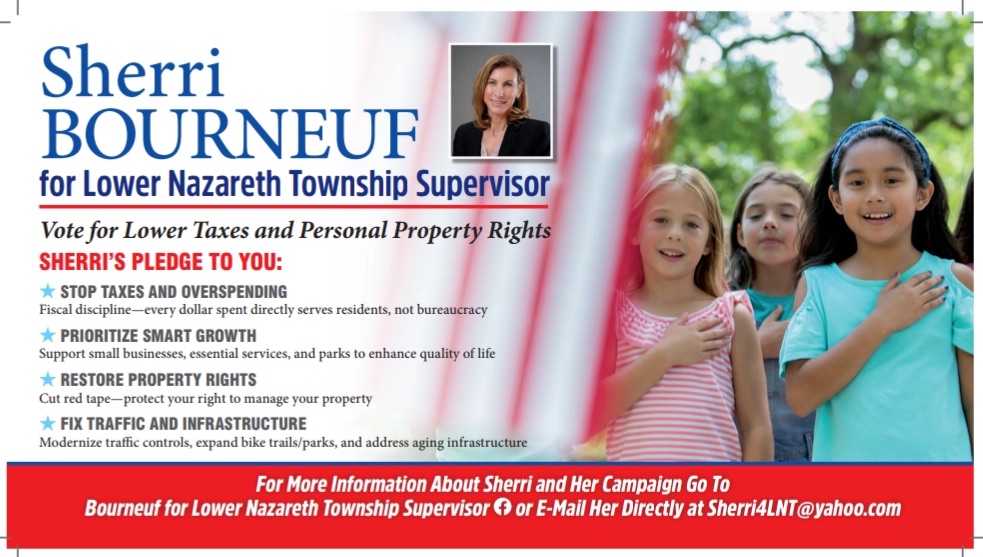 Vote for Sherri Bourneuf for Lower Nazareth Township Supervisor by Web Admin October 28, 2025 115 0 FacebookTwitterPinterestEmail previous post Vote for Michael Macsisak next post Slate Card directing you to our candidates – click to see more You may also like Attend Salute to Veterans November 5, 2025 Slate Card – check it out October 31, 2025 Who’s on the Ballot? – VOTE NO ON... October 31, 2025 Slate Card directing you to our candidates –... October 31, 2025 Vote for Michael Macsisak October 14, 2025 Attend Wednesday, October 15th ,meet and greet with... October 9, 2025 Attend NCRC Chairman’s Dinner at Hotel Bethlehem –... October 5, 2025 Letter to County Executive McClure October 4, 2025 VOTE NO on Retention for Supreme Court September 22, 2025 Attend Sherri Bourneuf candidate for Lower Nazareth Township... September 22, 2025